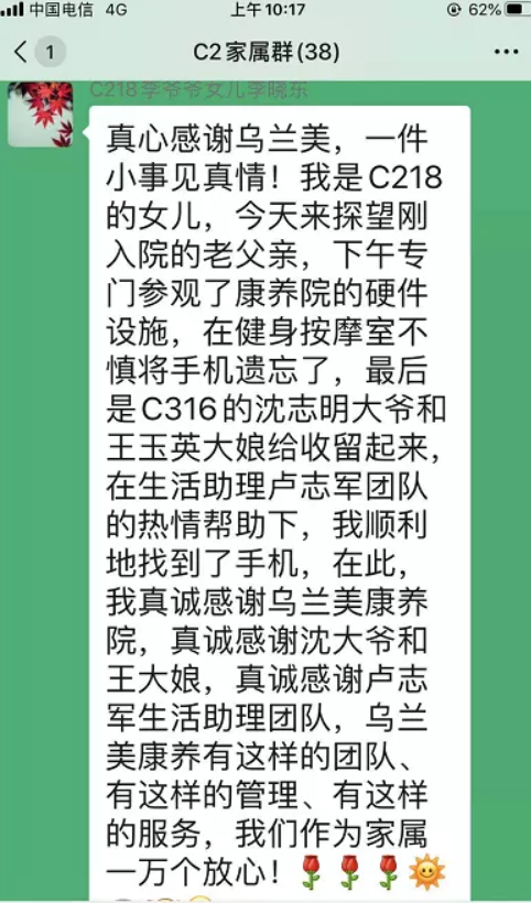 考慮到失主丟失財(cái)物焦急的心情,沈爺爺用餐過后便立即回到房間,正打算挨家挨戶找尋失主時(shí),碰到了前來尋找手機(jī)的C區(qū)二樓生活助理團(tuán)隊(duì)們。“真的特別謝謝大家的熱心幫助,當(dāng)烏蘭美的護(hù)士和生活助理人員知道我的手機(jī)丟失后,都自發(fā)的幫我找尋手機(jī)。我真的感到特別的暖心,特別的貼心。經(jīng)過這次事情,我對我老父親住在這里一萬個(gè)放心!因?yàn)檫@里的工作人員不僅細(xì)心呵護(hù)、照顧老人,還守護(hù)了他們的財(cái)產(chǎn)安全。”
